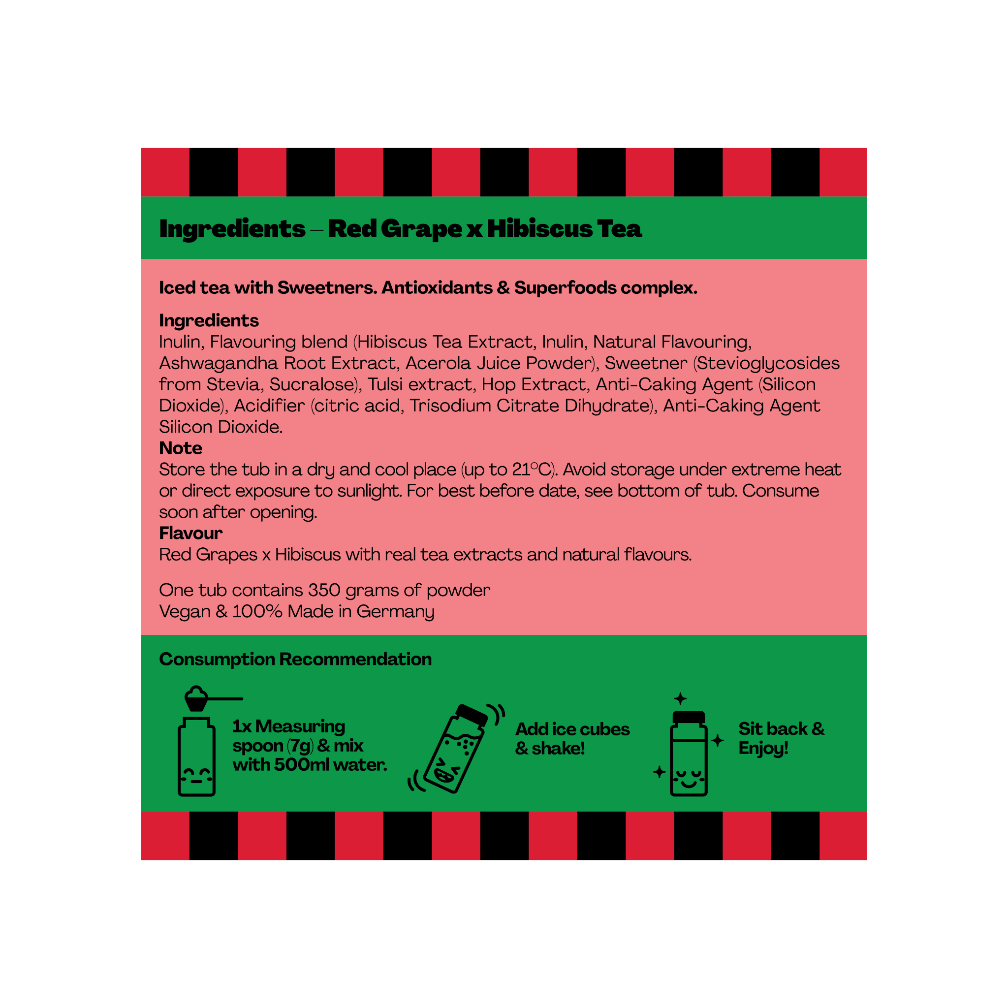 Experience the sweetness of red grapes with tangy hibiscus flowers. The grape gives the iced tea a natural fruitiness and the hibiscus gives it a refreshing acidity. The perfect drink for summer!